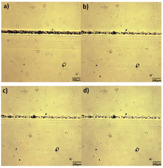 The self-repairing progress of FPT2 cross-linked material was observed by HSPM, and we could intuitively find out that prefabricated cracks are clearly repaired (Figure 7) after heating at 60 °C for 72 h. Above all, the film with a crack was placed at 120 °C for 2 h (Figure 7a), debonding occurred to provide an ability of chain reformation, and then placed at 60 °C for 48 h (Figure 7b,c), a clearly recovered sample was obtained, and the crack was gradually restored to the original surface. The width was obviously reduced compared with that before repairing, indicating that the film had self-repairing properties. When the film with crack was heated to 72 h at 60 °C, the crack did not show any significant change (Figure 7d).