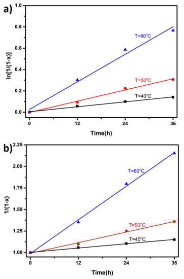 Linear fit of the data is conducted according to (a) first-order kinetics; (b) second-order kinetics.