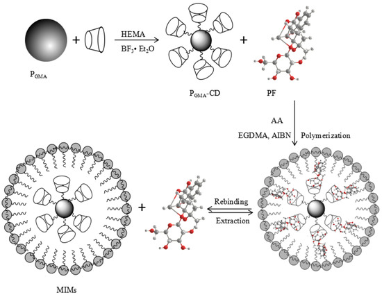 In this paper, MIMs for PF were prepared by surface imprinting [19]. Uniformly sized poly(glycidyl methacrylate, GMA) microspheres (PGMA) were invoked as the backing material, β-CD and AA as the functional monomers, and PF as the template molecule. The performance of MIMs was evaluated by adsorption experiments and chromatographic experiments. The MIMs exhibited excellent PF chromatographic performance, such as good separation of PF and its structural analogue albiflorin (AF) and larger adsorption capacity. This research might provide a new approach to the further separation and purification of natural products from natural product extracts.
