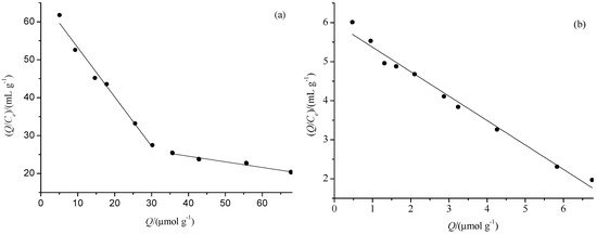The Scatchard dissociation curves of PF on MIMs-1 and NIMs-1 are shown in Figure 6. There were two discontinuous liners for MIMs-1, which indicated there were two types of affinity binding sites in MIMs-1. On the contrary, there was only one line for NIMs-1, which indicated there was one type of binding sites in NIMs-1. For MIMs-1, the regression equation was Q/Ce = −1.300 Q + 66.20 (r = 0.9816) for the higher affinity binding site, and the regression equation was Q/Ce = −0.148 Q + 30.61 (r = 0.9574) for the lower affinity binding site. Therefore, KD and Qmax were 0.7692 mmol·g−1 and 50.92 μmol·g−1 for the higher affinity binding site, and 6.7568 mmol·g−1 and 206.83 μmol·g−1 for the lower affinity binding site, respectively, according to the two regression lines. For NIMs-1, the regression equation was Q/Ce = −0.626 Q + 5.9953 (r = 0.9831), and KD and Qmax were 1.5974 mmol·g−1 and 9.577 μmol·g−1, respectively. The main reason for the difference of the Scatchard curves of MIMs-1 and NIMs-1 were the different recognition sites were preserved in the two kinds of polymers.