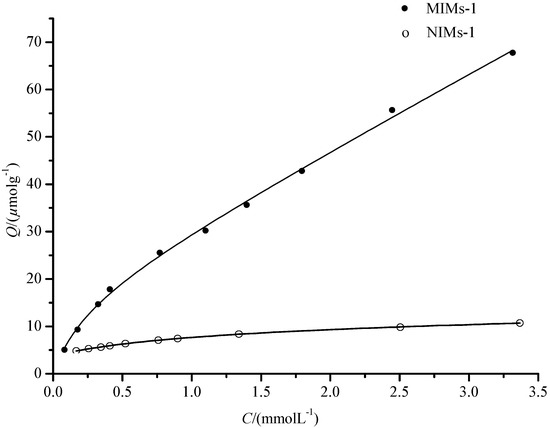 Fifty mg of MIMs or NIMs were placed in a tube and conditioned with 10 mL of 1.0–10 μmol·mL−1 solutions of PF (each solution concentration increased by 1.0 μmol·mL−1). The tube was incubated in a shaken bed at 25 °C for 80 min. The solutions were analyzed by HPLC, and each analysis was repeated three times.
