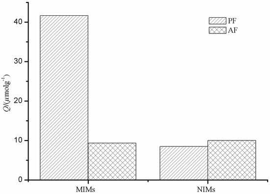 Selectivity of MIMs with regard to NIMs was studied, and the result is shown in Figure 8. As can be seen from Figure 8, MIM particles have a higher selective adsorption towards PF compared to AF, while the adsorption capacities of PF and AF by NIMs were almost similar to each other. Imprinting sites formed in the MIMs have the capability of distinguishing target molecules through their size, shape, and functional group distribution. However, there are non-imprinting sites in NIMs to adsorb PF and AF.