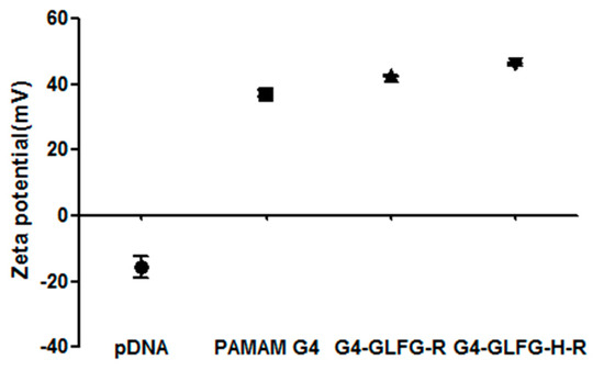 For stable gene transfection into cells, polyplex should overcome unwanted reactions such as nuclease action and endosomal/lysosomal degradation during cellular pathway [25]. Therefore, the formation of stable and compact polyplexes is essential for releasing and protecting pDNA. The formation of a cationic polyplex allows the anions of the cell membrane to be overcome and facilitates the stable release of pDNA into the cytosol. The diameter and surface charge of G4-GLFG-R and G4-GLFG-H-R was analyzed by DLS and zeta potential measurements. As shown in Table 1, the polyplex of G4-GLFG-R:pDNA (8:1, w/w) showed a mean diameter of 199.3 ± 3.9 nm, and G4-GLFG-H-R:pDNA (10:1, w/w) was 177.23 ± 2.6 nm. Both polyplexes displayed low polydispersity index (PDI), indicating that these polyplexes were homogenous. This result indicated that these PAMAM derivatives can form nano-scale polyplexes owing to electrostatic interactions. The small size of the polyplexes could facilitate effective cellular uptake for gene delivery. As shown in Figure 5, native PAMAM G4/pDNA showed a positive charge of 37.2 ± 1.95 mV and polyplexes of G4-GLFG-R and G4-GLFG-H-R also showed positively charged zeta potential values of 42.63 ± 0.38 mV and 46.03 ± 0.81 mV, respectively. The polyplexes of G4-GLFG-R and G4-GLFG-H-R have values of more than 20 mV, and are thought to possess sufficient cationic charge to be delivered inside cells.
