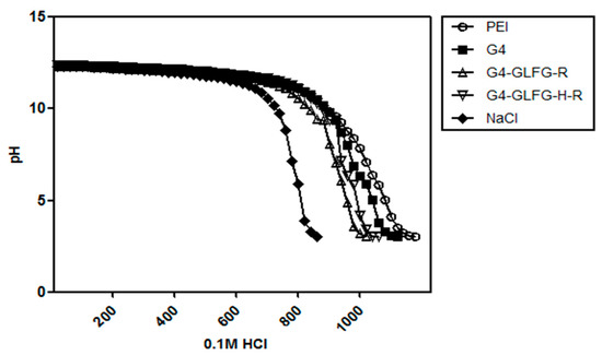 G4-GLFG-H-R has an imidazole group from the histidine residue, which has a pKa value of about 6 and is mostly protonated at acidic pH conditions less than 6. Thus, G4-GLFG-H-R is believed to have a proton buffering effect at endolysosomal pH values, and G4-GLFG-H-R can play an important role in intracellular escape based on the buffering capacity effect [17]. As shown in Figure 6, as a positive control, PEI 25 kD showed strong buffering capacity effect. Additionally, PAMAM G4, G4-GLFG-R, and G4-GLFG-H-R showed proton buffering effect compared to NaCl control. As expected, G4-GLFG-H-R showed increased buffering capacity at pH 5–7 compared to G4-GLFG-R, suggesting that G4-GLFG-H-R could overcome endosomal acidic conditions and might be more effective at gene transfection efficiency.