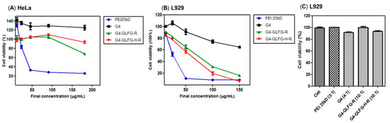 HeLa human epithelial carcinoma cells (ATCC® CCL-2), and L929 mouse fibroblasts (ATCC® CCL-1) were maintained in a CO2 incubator (37 °C, 5% CO2). HeLa cells were grown in 89% Dulbecco’s modified Eagle’s medium (DMEM) with 10% fetal bovine serum (FBS) and 1% antibiotic-antimycotic solution and L929 cells were grown in 89% RPMI 1640 with 10% FBS and 1% antibiotic-antimycotic solution. Cells were subcultured using 0.25% trypsin-EDTA solution. Cytotoxicity assays were performed using MTT (3-(4,5-dimethylthiazol-2-yl)-2,5-diphenyl -tetrazolium bromide) in HeLa, L929 cells. Cells were seeded at a density of 1.5 × 104 cells/well in 96-well plates. Cells were then treated with G4-GLFG-R or G4-GLFG-H-R at final concentrations 12.5, 25, 50, 100 and 200 µg/mL. After 24 h, 10 µL MTT solutions (2 mg/mL in DPBS) were added to each well, and cells were incubated for an additional 4 h. After incubation, old medium was removed and formazan was dissolved in DMSO. Absorbance was measured at 570 nm using a VERSAmax microplate reader (Molecular Devices, Sunnyvale, CA, USA). A cytotoxicity assay of polyplex was performed using MTT assay in L929 cells. Cells were seeded at a density of 1.5 × 104 cells/well in 96-well plates. Polyplex was prepared PEI 25kD (3:1, polymer:pDNA (0.2 µg), w/w), PAMAM G4 (4:1), G4-GLFG-R (10:1), and G4-GLFG-H-R (10:1), and sample was treated. After 24 h, MTT solutions were added to each well and the above procedure was carried out.