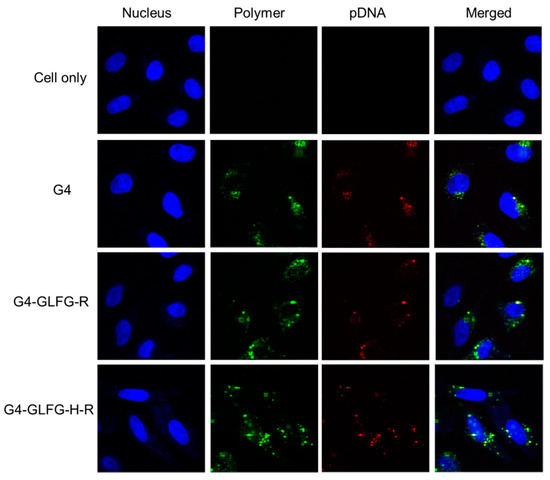 To observe cellular internalization of G4-GLFG-H-R, the polymer was labeled with Alexa Fluor 488 (Green), and pDNA was labeled with Alexa Fluor 546 (Red). The labeled polyplexes were incubated with HeLa cells for 24 h and observed using confocal microscopy. As shown in Figure 9, PAMAM G4/pDNA polyplex exhibited red and green fluorescence signal in the cytoplasm, andG4-GLFG-R/pDNA and G4-GLFG-H-R/pDNA polyplexes showed overall distribution inside the cells. Interestingly, the pDNA signal of G4-GLFG-H-R polyplexes were mostly localized in the perinuclear sites compared to other polyplexes. These results indicate that G4-GLFG-H-R facilitates endosomal escape, and pDNA could be effectively released into cytoplasm owing to the GFLG sequence by cathepsin B.