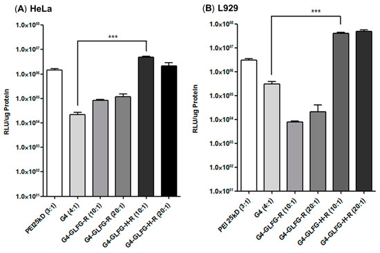 To evaluate transfection efficiency, firefly luciferase gene (pCN-luc gene) was used as a reporter gene and luciferase activity was detected from isolated protein in HeLa and L929 cells. Polyplexes of G4-GLFG-R and G4-GLFG-H-R were prepared at both 10:1 and 20:1 weight ratios. Branched PEI 25 kD and PAMAM G4 dendrimers were used as the control. Interestingly, as shown in Figure 10, G4-GLFG-H-R displayed higher transfection efficiency compared to PAMAM G4 and PEI 25 kD for HeLa and L929 cells. The buffering capacity of G4-GLFG-H-R may induce the release of the polyplexes from endo/lysosomes and increase the gene expression level due to plasmid DNA release by cathepsin B [17]. Finally, G4-GLFG-H-R has enhanced transfection efficiency owing to efficient intracellular uptake, increased proton buffering capacity, and enzyme-sensitive collapse of polyplexes.