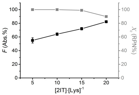 The degree of triple helix preservation (Xc) of the collagen after functionalisation was determined using CD with normalisation against the RPN value of native collagen. The functionalised collagen displayed high preservation of triple helices (Xc > 80 RPN %) regardless of the degree of F (Abs. %), with almost quantitative yield (Xc: 90 RPN%) in 2IT-reacted products with a degree of functionalisation of up to 72 Abs. % (Figure 1); this is beneficial to preserve the native protein organisation and high natural affinity for cells [23]. For further experiments, collagen-SH was prepared using 15 times excess (F: 72 Abs. %, Xc: 90 RPN%).