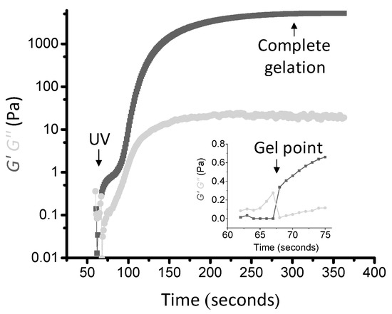 The UV light was turned on 60 s after the start of the time sweep, which promptly induced the formation of a covalent network, and is clearly indicated by the detection of a gel point (the time at which the storage and loss moduli equate or crossover) seven seconds after the photo-activation [51,52].