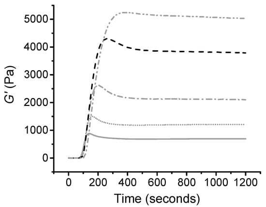 Curing time sweep measurements of thiol-ene collagen mixtures prepared with 0.5% (w/v) LAP and varied PEG content. CollPEG2: (―); CollPEG2.5: (⋅⋅⋅); CollPEG3: (-⋅-); CollPEG3.5: (- -); CollPEG4: (-⋅⋅-).