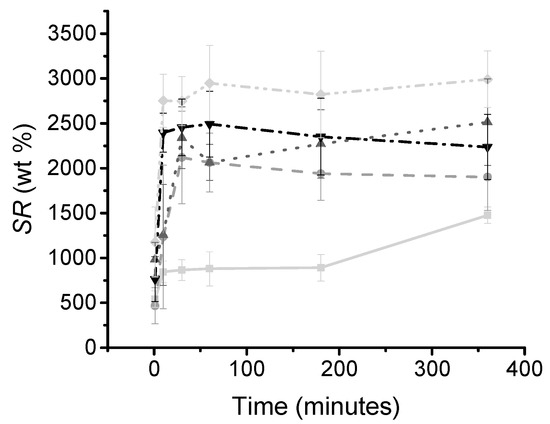 Dehydrated samples (2–5 mg) were individually placed in 1 mL of distilled water at 25 °C under mild shaking. At specific time points, the swelling ratio (SR) was calculated using the following equation: