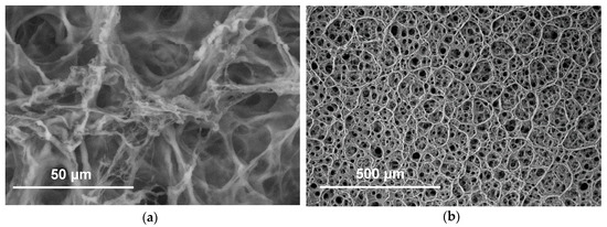SEM images were taken in the wet state to analyse the morphology of the photo-click hydrogels in near-physiological conditions (Figure 6). Pore sizes in the range of 30–80 µm were observed. Pores may likely be formed in the hydrogels following stirring and casting of the thiol-ene mixture. Pore size is an important feature in regenerative devices to allow sufficient material surface for cell seeding and cell diffusion. Additionally, pores should be large enough to promote cell diffusion and vascularisation [56].
