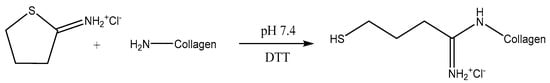 Functionalisation of the available amine group in collagen with 2-iminothiolane (2IT).