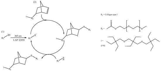 Illustration of the thiol-ene photo-click reaction mechanism between collagen-2IT (1) and PEG-NB (2). Radical-mediated step-growth thiol-ene network formation was initiated via UV activation of aqueous solutions containing 2IT-functionalised collagen precursor and 8-arm (f = 8) norbornene-terminated PEG in presence of either LAP or I2959 photoinitiator.