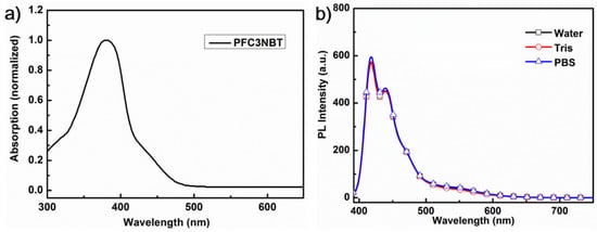 Normalized UV-Vis absorption spectrum of PFC3NBT in water (a) and PL spectra of PFC3NBT at RU = 4.5 μM in water (black), Tris HCl (red) and PBS, pH = 7.4 (blue); (b) (excitation at 380 nm).