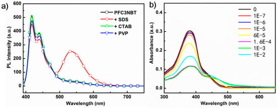 (a) PL spectra of PFC3NBT in the absence and presence of surfactant of SDS, CTAB, PVP ((RU) = 4.5 μM, [surfactant] = 5 μM, excitation at 380 nm); (b) UV-Vis spetra of PFC3NBT ([RU] = 4.5 μM) in the absence and presence of SDS with the concentration ranging from 0 to 20 mM.