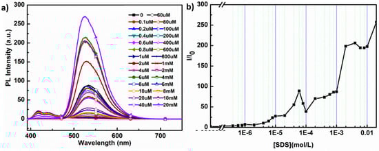 (a) PL spectra of PFC3NBT in the absence and presence of SDS with the concentrations of SDS ranging from 0 to 20 Mm; (b) fluorescence intensity at 545 nm (I545) in the prescence of SDS at adverse concentrations vs. that in the absence of SDS ((RU) of PFC3NBT = 4.5 μM, excitation at 380 nm).