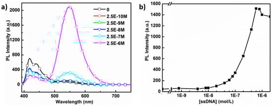 (a) PL spectra of PFC3NBT after addition of ssDNA at adverse concentrations; (b) fluorescence intensity at 545 nm in the presence of ssDNA at adverse concentrations ((RU) of PFC3NBT = 4.5 μM, excitation at 380 nm).