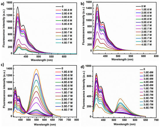 PL spectra of PFC3N after addition of ssDNA (a) and ssDNA-FAM (b) at adverse concentrations; PL spectra of PFC3NBT after addition of ssDNA (c) and ssDNA-FAM (d) at adverse concentrations ((RU) of CPEs = 6 μM, excitation at 380 nm).