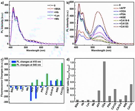 PL spectra of PFC3NBT in PBS (pH = 7.4) in the absence and presence of different proteins (a) for BSA, Hb, Lys and Mb; (b) for AFP, CEA, PSA, CA125, CA19-9, NSE and CA153. RU = 4.5 μM, [protein] = 0.25 μM or less. Excitation at 380 nm; (c) the changes of the fluorescence emission peaks at 418 (∆I418 nm) and 545 nm (∆I545 nm) as a function of proteins; (d) the FRET ratio of the green emission at 545 nm to the blue emission of PFC3NBT at 418 nm (I545/I418) as a function of proteins.