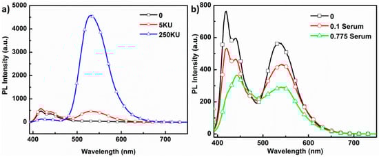 (a) PL spectra of PFC3NBT in PBS (pH = 7.4) in the absence and presence of CA153 at the concentration of 0 ku, 5 ku and 250 ku. (b) PL spectra of PFC3NBT in PBS (pH = 7.4) in the presence of CA153 = 5 ku with a different fraction of serum in PBS/serum mixture (fraction calculated by v/v). RU = 4.5 μM. Excitation at 380 nm.