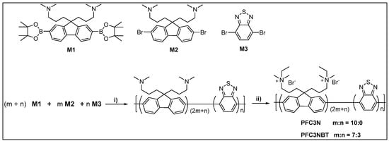 2.3. Preparation of Poly({9,9-bis[3’-(N,N-dimethylamino)propyl]-2,7-fluorene-4,7-benzothiadiazole})