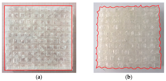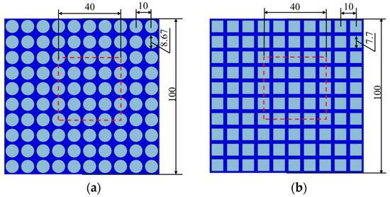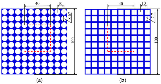 The composite material that is composed of two components (hydrogel and elastomer) has been proposed in our previous work [32]. In the earlier study, we can easily understand that if the holes are filled with a more rigid material than that of the matrix, the cellular structure will not lead to any pattern switch [33]. Therefore, a much softer material needs to be placed in the holes to achieve the pattern switch for a composite material. Mullin et al. [34] discovered that the inclusion which has a Young’s modulus of greater than 1% of the bulk would suppress the pattern switch. Based on present assumptions and finite element analysis (FEA), we propose here to use two kinds of hydrogel-elastomer composite material which experimentally exhibit the pattern switch in composite gel material. In the modeling and the experiment, the specific combinations of the two materials are illustrated in Figure 8. The specimen shown in Figure 8a is a 100 mm × 100 mm square model of circular gel inclusions of 8.67 mm diameter with 10 mm center-to-center spacing in both vertical and horizontal distributions; the specimen shown in Figure 8b is 100 mm × 100 mm model with 10 × 10 mm2 square arrays of gel inclusions of 7.7 mm length. The volume fractions of gel in the two types of composite materials have the same percentage of 59%.