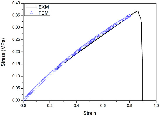 The first material used for the cellular structure was a 3D-printing material called TangoBlackPlus® (TBP for short, Stratasys® Inc., Eden Prairie, MN, USA), for which the Young’s modulus was 0.5 MPa and tensile strength was 1.2 MPa [31]. These two properties of this base material was determined by dynamic mechanical analysis (DMA). Meanwhile, the same mechanical behavior of this rubber-like material was characterized through the dog-bone-shape samples after they had been stretched in the uniaxial tension mode in a SHIMADZU (AGS-X1kN + 250 mm) testing machine (Shimadzu Corp., Kyoto, Japan). A constant strain rate of 5 mm/min was applied during loading. Dog-bone-shaped samples (refer to Figure 2)—which follow the ASTM/D638 standard (type III)—were prepared by 3D-printing technology. For simplicity, the strain and stress discussed here are the nominal strain and stress. Thus, the elastomeric stress-strain behavior can be modeled as a linear elastic model with Young’s modulus of 592.92 kPa and Poisson’s ratio of 0.44, the values of which we will use for modeling and simulation in the next Section. Figure 3 shows a comparison between the finite element method (FEM) results and the experimental output data.