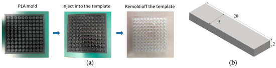 We also used PDMS (polydimethylsiloxane) as the matrix material. First, we employed 3D printing technology to build a PLA (polylactic acid) mold and inject PDMS to fabricate the cellular structures (as shown in Figure 4a). The PDMS system of choice for the present process is Sylgard 184 (DOW Corning, Midland, MI, USA), which is applied in a 25.1:1 ratio (w/w) of siloxane and curing agent, and requires a thermal curing step at 70 °C for three hours. The mechanical behaviors for PDMS were characterized through the strip-shape samples (as shown in Figure 4b). Once the Young’s modulus of the PDMS is obtained through uniaxial tension testing, the elastomeric stress-strain behavior can be modeled as a compressible Neo-Hooken model with the initial Young’s modulus of 0.2 MPa and Poisson’s ratio of 0.48.