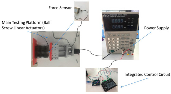 Following the construction of the soft cellular solids (shown in Figure 1), we then used two different rubber-like materials to fabricate the continuum version of the porous periodic lattice structures. In order to achieve quantitative experimental results, we devised the test system for the soft material. The testing device can be divided into four parts: Main Testing Platform with Ball Screw Linear Actuators; Force Sensor; Integrated Control Circuit; and Power Supply (as shown in Figure 5). Each specimen was subjected to uniaxial compression in the plane of the sheet, at a constant nominal strain rate of 1 mm/min using a handmade screw-driven testing machine. The nominal stress vs. nominal strain behavior was recorded, based on computed data from the measured force and displacement.