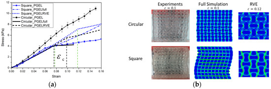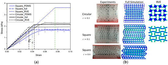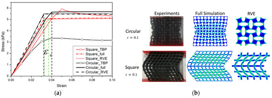 The mechanical behavior for TangoBlackPlus® cellular structures is as follows: (a) Nominal stress vs. nominal strain curves (red solid line with open symbols and black solid line with open symbols, respectively, represent TBP with square voids and circular voids. Red dot dash dot line and red dot line depict the full model and RVE simulations for the TBP model with square voids; black solid line and black dash line show the full model and RVE simulations for the TBP model with circular voids); (b) Experimental images of structures at a macroscopic strain of 0.1.