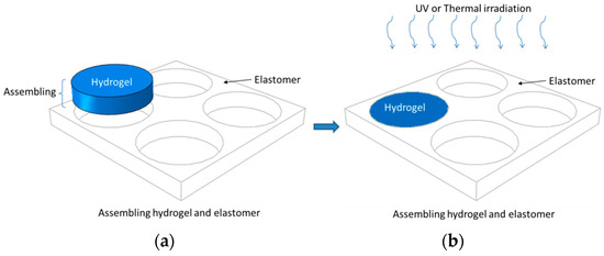 A schematic illustration of the fabrication of robust micro-structured hydrogel–elastomer composite material: (a) The pre-shaped hydrogel and elastomer are assembled together; (b) After ultraviolet or thermal irradiation, the resultant hydrogel composite material forms.