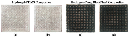 To obtain robust interfaces for composite hydrogel–PDMS solids, we adopt the simple yet versatile method proposed by the Zhao group [38]. The key point is to address PDMS’ oxygen inhibition. We spray the acetone solution of diphenyl ketone on the elastomer surface and use an ethanol solution to wash it several times for surface absorption of the benzophenone solution. The benzophenone acts as an ultraviolet-assisted grafting agent for covalent crosslinking hydrogel polymers on elastomer surfaces. The assembled composite material is exposed under ultraviolet irradiation together with the synthesis of polyacrylamide hydrogel. The hydrogel–TangoBlackPlus® composite material can be simplified by filling the pre-shaped hydrogel into the porous material, which means that there is no bonding between the matrix material and inclusions. This is mainly due to the elastomer surfaces’ inhibition of polymer crosslinking and grafting, as well as fluidic characters of pre-gel solutions (which will block the interfacial connection if no special chemical treatment is carried out). The hydrogel–elastic composite materials fabricated are illustrated in Figure 10.