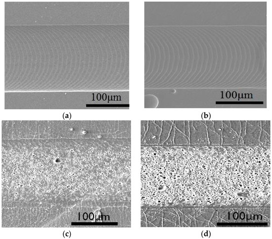 Scanning Electron Microscope (SEM) images of (a) poly(glycerol sebacate) (PGS) ablated under laser fluence of 6 J cm−2; (b) poly(1,3-diamino-2-hydroxypropane-co-polyol sebacate) (APS) ablated under laser fluence of 6 J cm−2; (c) poly(dimethyl siloxane) (PDMS) ablated under laser fluence of 6 J cm−2; (d) PDMS ablated under laser fluence of 9 J cm−2.
