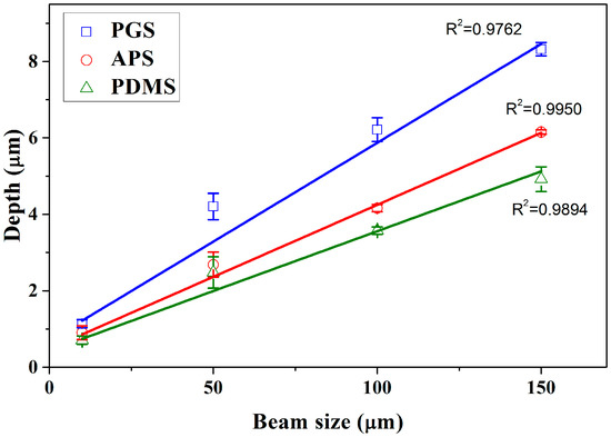 Through the modification in beam sizes (aperture size), the width of microchannels is highly tunable, and possesses a wide application, especially in mimicking microvasculature. For example, by utilizing beam size of 10 μm, it is possible to create channels resembling capillary, while 50 μm beams are capable of mimicking the arteriole and venule. Through theoretical calculation, at constant fluence, as the beam sizes increases, the total energy per ablation increases linearly with area. This effect was observed in Figure 2, which measures the variations in depth over different beam sizes (obtained from Surface Topography Profilometer) on PGS, APS and PDMS under fixed ablation fluence 6 J cm−2. The depth is observed to have increased with beam size, and the coefficients of beam size with depth on PGS, APS and PDMS were 0.9762, 0.9950 and 0.9894, respectively. As discussed in the work of Sizyuk et al. [45], increase in beam sizes (spot sizes) often lead to higher plasma temperature, which may directly result in higher etching efficiency.