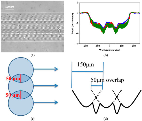 The width of ablated channels is directly correlated to the beam size of laser used, and in this work, it ranged between 1 to 150 μm. In order to create wider channels, channels created by overlapping linear laser ablation were investigated. In Figure 3, 350 μm wide channels were created with three linear ablations operated with beam size of 150 μm, fluences of 6 J cm−2, ablation frequency at 10 Hz and ablation progression speed at 100 μm s−1. Each linear pattern overlapped by 50 μm, and the total width of three ablations with two overlaps was about 350 μm. In Figure 3a, a linear channel of 350 μm wide with two visible overlapped sections are observed under optical microscope. Surface profilometer was employed to further examine the depth of channel made by overlapped patterns, and is shown in Figure 3b. The results show that there are two dimples in the bottom of channels, creating a “w” shaped pattern. It is verified that the position of the dimples in the channel is consistent with the overlapped area of each linear pattern (Figure 3c). As a result, it may suggest that the two dimples were caused by overlapped ablation, as shown in Figure 3d. The overlapped area was doubly ablated, thus received more energy than other parts, resulting in the two dimples. It is noted that there are micropatterns inside the channels shown in Figures 1a,b and 3a perpendicular to the moving direction of laser beam, but they are relatively shallow compared to the channels, such that they were not observed through the surface profilometer at all, as shown in Figure 3b.