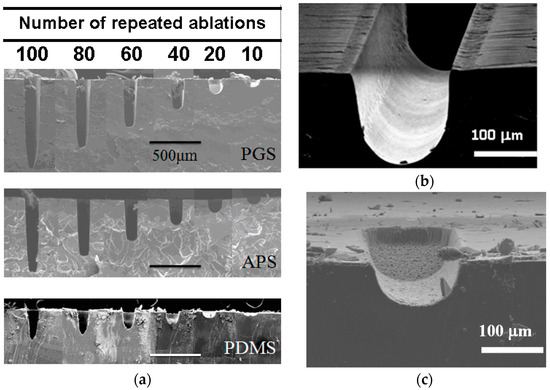 (a) The SEM images of three materials with increasing ablation times. (b) Laser ablated 25 times on PGS presented high edge quality. (c) Laser ablated 25 times on PDMS presented poor edge quality.