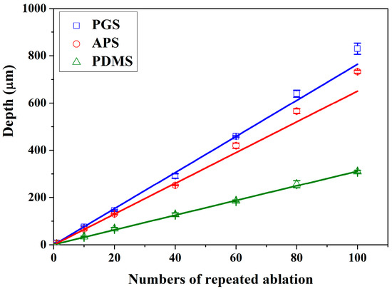 Number of repeat ablations and depth of channels are in direct correlation with slope of 7.64, 6.51 and 3.11 μm per ablation for PGS, APS and PDMS, respectively.