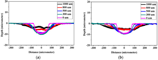 By combining the observations in Figure 6d,e, it is clear that for reliable ablation depth estimation, the defocus distance must be readjusted within depth of 500 μm. However, since Figure 6c clearly illustrates that the width of channels increases with defocus distance linearly, the error margin for width may be well over 200%, making it essential to readjust the defocus distance earlier than 500 μm. In this work, it is suggested that the defocus distance be adjusted every 75 μm ablated in depth, so that the variation in channel width be maintained within 20%.