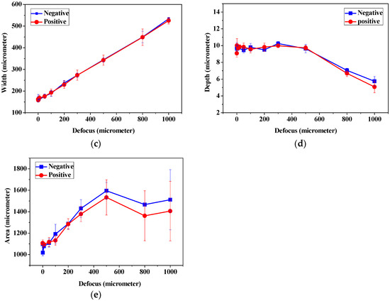 Laser ablation shape at different defocus (a) negative and (b) positive. The corresponding (c) width, (d) depth and (e) area of channels ablated at different distances of defocus. The conditions of lasers: fluence of 6 J cm−2, beam size of 150 μm, beam firing frequency at 20 Hz, ablation progression speed at 100 μm s−1, and 1 time of repeated ablation.