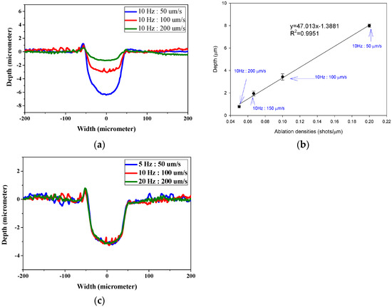 Figure 7 demonstrates the laser ablation shape and corresponding depth of channels ablated at different ratios between firing frequency and ablation progression speed. In Figure 7a, the channels ablated at ablation progression speed of 100 μm s−1 appear almost doubled in depth than that of 200 μm s−1 when the firing frequency is 10 Hz, indicating an inverse correlation between channel depth and ablation progression speed. The corresponding depth of channels ablated at different ratios between firing frequency and ablation progression speed are presented in Figure 7b. The concept of ablation densities along the moving axis is proposed by calculating the total number of ablations occurring in 1 μm distance. The results suggest that the higher the ablation density, the deeper the depth of channels. This indicates a direct result of increased accumulation of energy per ablation. With the high correlation (R2 = 0.9951), it is concluded that channel depth is inversely correlated to ablation progression speed. As the ablation progression speed and beam firing frequency is adjusted, it is hypothesized that the similar “ratio” between the two is a more dominant factor than the absolute numbers. To analyze from an ablation per area perspective, a laser beam firing at 10 Hz and moving at 100 μm s−1 fires the same number of shots as one ablating at 20 Hz, 200 μm s−1. The main difference between the two is that the amount of energy received in the same amount of time is doubled. As shown in Figure 7c, the ablation shape made by the different ablation progression speed and beam firing frequency is the same regardless of the absolute ablation progression speed and beam firing frequency. This phenomenon is also observed by Arutinov et al. with respect to nanosecond and picosecond lasers [16].