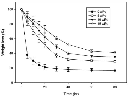 Figure 3 shows the swelling behavior of the CH–CMC hydrogel. In this experiment, the radiation dose was 75 kGy. The swelling behavior of the CH–CMC hydrogel significantly increased with increased honey content. When comparing CH–CMC hydrogel (15 wt %) to neat CMC hydrogel (0 wt %), the difference in swelling ratio was indicated to be multiplied more than tenfold. These results indicate that CH–CMC hydrogel can provide a better moisture environment, and absorb wound exudates for wound healing.