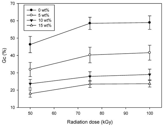 Figure 2 shows the Gc as a function of CH concentration in a CH–CMC hydrogel. The Gc of the CH–CMC hydrogel increased when increasing the radiation dose. This result indicates that radiation is a useful method to make a CMC hydrogel, because gamma-ray irradiation provides energy for the formation of free radicals, accelerating the cross-linking reaction [23]. However, the Gc of the CH–CMC hydrogel decreased with an increase in the content of CH. The possible reason for this result is that the complex including sugar in CH discouraged the formation of the crosslinking structure of the CMC hydrogel [2].