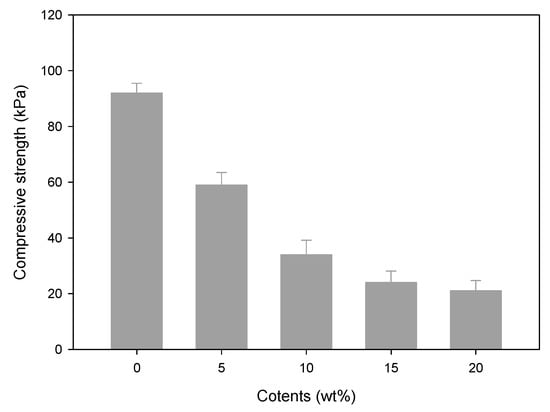 Figure 4 shows the compressive strength for the CH–CMC hydrogel with the contents of honey. The compressive strength decreased with an increase in honey content. The compressive strength of pristine CMC hydrogel (0 wt %) was measured at 91 kPa, whereas that of CH–CMC hydrogel (20 wt %) was measured at 22 kPa. In general, the compressive strength of the hydrogel was proportional to the Gc. In fact, the compressive strength of the CMC hydrogel substantially decreased owing to the presence of CH as compared with a pristine CMC hydrogel.