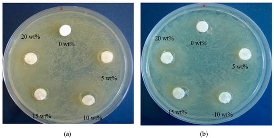 Antibacterial image of CH–CMC hydrogels with different content of honey against S. aureus (a) and E. coli (b).