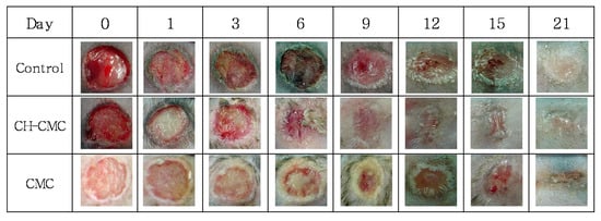 Photographs of wound healing observation by dates; control (non-treated wound), CH–CM (CH–CMC hydrogel-treated wound), CMC (CMC hydrogel-treated wound).