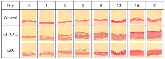 The treatment tendency of ulcers was studied by examining the histology. Figure 8 shows the change in granulation tissue formation. The histology evaluation demonstrated that there was a significant acceleration of dermal repair in wounds treated with CH–CMC dressings. There were no significant differences in the granulation tissue formation among the three groups on the first day. However, compared with the control (non-treated wounds) and CMC (CMC dressing-treated wounds), the thickness of granulation tissue in wounds treated with the CH–CMC dressing began to be significantly enhanced on the third day. The granulation tissue in wounds treated with CMC dressings grew slowly until day 9, and a rapid growth began from day 15. On the other hand, there was not much difference from the thickness of the granulation tissue of the control between day 0 and day 21. This result indicates that the CMC hydrogel supplied a greater water environment for wound healing, and that the CH in CMC hydrogel further accelerated the granulation tissue formation.
