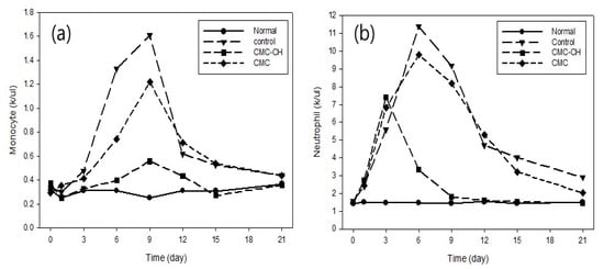(a) Monocyte and (b) neutrophil in wound healing; Normal (harmless mice) control (non-treated wound), CH–CM (CH–CMC hydrogels treated wound), CMC (CMC hydrogels treated wound).