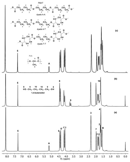1H NMR analyses were carried out using a Bruker-Advance spectrometer operating at 600 MHz with Bruker TOPSPIN 2.0 software (Bruker, Billerica, MA, USA). CDCl3 was used as the solvent, and tetramethylsilane (TMS) was used as the internal standard. Each spectrum was obtained with 64 scans, a 11 μs pulse width, and a 2.66 s acquisition time. The PBAT and PLA blend composition was determined based on integration of the signal of the methine group of the PLA component (at δ = 5.20 ppm) and the signals of methylene groups in the aromatic and aliphatic dyads presented in the 1H NMR spectrum in the region between δ = 4.0–4.5 ppm, i.e., signals 1, 1′, 6, and 6′ ascribed to the respective structures of PBAT (see Figure 5 in Results and Disccusion). The composition of the PBAT component (mol % of aromatic and aliphatic units) was calculated based on the intensities of the signals of the methylene groups in the aromatic and aliphatic dyads (in the region between δ = 4.0–4.5 ppm; see Figure 5) according to [13].