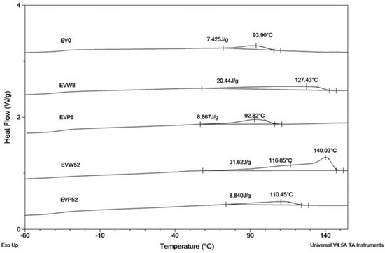 Samples incubated in water showed changes in the crystallization region due to the fact that after degradation of the PLA component, the remaining sample contained only the PBAT component (Figure 6 shows DSC curves of samples EVW8 and EVW52, respectively after 8 and 52 weeks of incubation). For the sample EVW8 after 8 weeks of incubation in water, the broad region with crystallization temperature (Tc) at 127.4 °C was observed. The DSC curve of the EVW52 sample showed a broad double exotherm in the crystallization region. The crystallization pick at 140 °C was noticed in the EV sample after 52 weeks of degradation in water. The observed value of the crystallization temperature was characteristic for the PBAT with the increased content of aromatic segments [27]. The increased content of the PBAT aromatic segments, due to privileged hydrolytic degradation of aliphatic structural units, was confirmed also by the NMR results (see Figure 5) [17]. Comparing the DSC curves of EVP8 and EVP52 samples incubated in paraffin with the initial DSC curve of EV0, it was found that the PBAT and PLA blend in paraffin did not show differences within the crystallization region nor the incubation time.